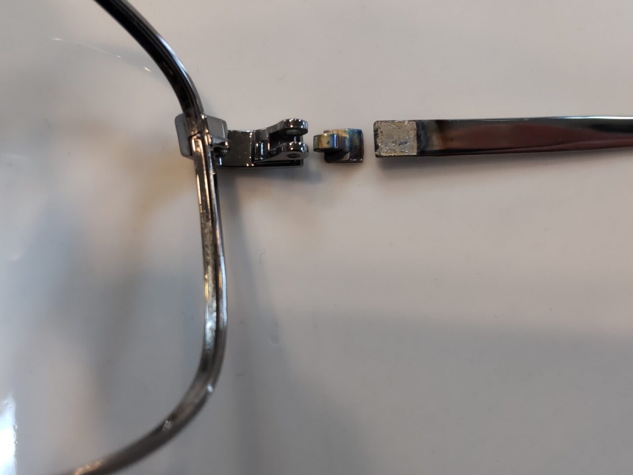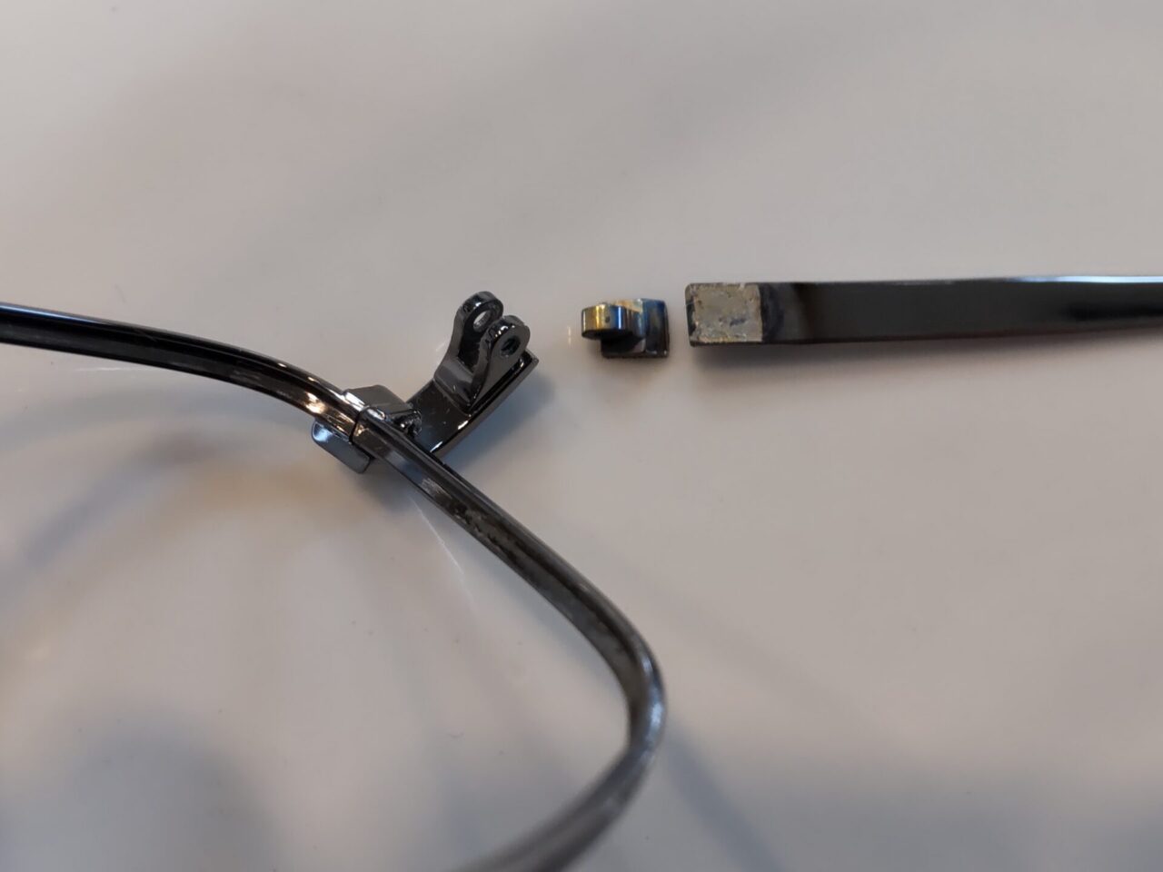 下の写真2枚のように、ロー付けタイプの部品はヨロイ(前枠側)もしくはテンプル(つるの部分)と1枚コマもしくは2枚コマという別々の部品をくっつけているので、どうしても取れる(ロー離れを起こす)可能性があります。(写真は、熱を加えロー離れした状態です。)